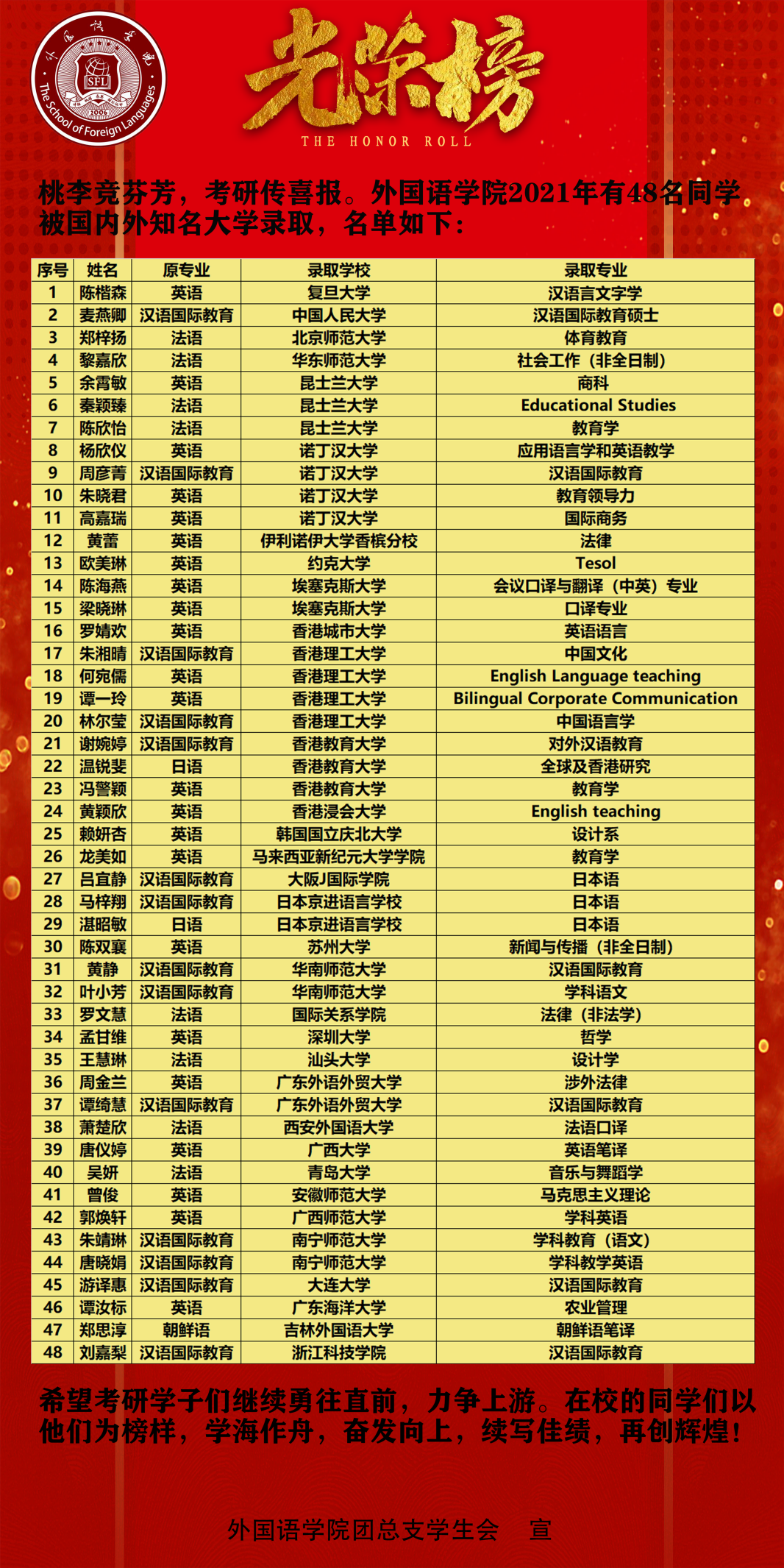 “长风破浪会有时,直挂云帆济沧海。”2021年,外国语学院的考研学子频频传来可喜的成绩。其中,48名同学分别被复旦大学、中国人民大学、昆士兰大学、诺丁汉大学等众多国(境)内外知名大学录取,涵盖了教育学、语言学、翻译学、设计学、哲学等多个学科专业。