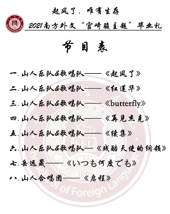 如千寻一般念念不忘,始终铭记自己最初的模样;如二郎一般勇敢追求,印证梦想的存在是借以人与神比肩的理由;再和龙猫一起守护微风吹过的麦田和旷野,和希达、巴鲁一起到天空之城去历险。又到凤凰花开的时候,希望“起风了,唯有生存——2021年南方外文宫崎骏主题毕业礼”会让年少有梦的你,继续保留对这个世界最大的好奇和最真的善意。