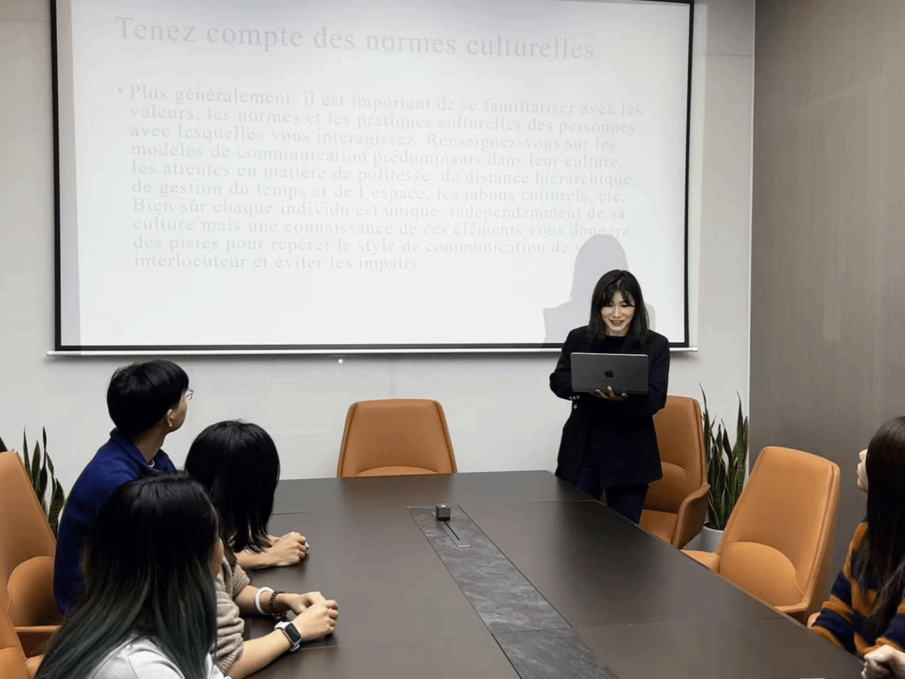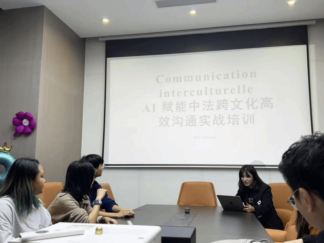 培训环节中最受学子欢迎的当属跨文化场景模拟模块。学子们分组扮演中法企业谈判代表,面对“商务礼仪差异”“技术需求误读”等典型问题,借助AI实时提示功能调整沟通策略。当模拟结束后,系统自动生成的沟通效果分析报告,让大家清晰看到自身在文化敏感度、表达逻辑性上的优势与不足。法语系执行主任牛文培全程参与体验,她表示:“这种将AI技术与跨文化场景深度融合的培训模式,正是高校法语人才培养需要补充的实践维度。”