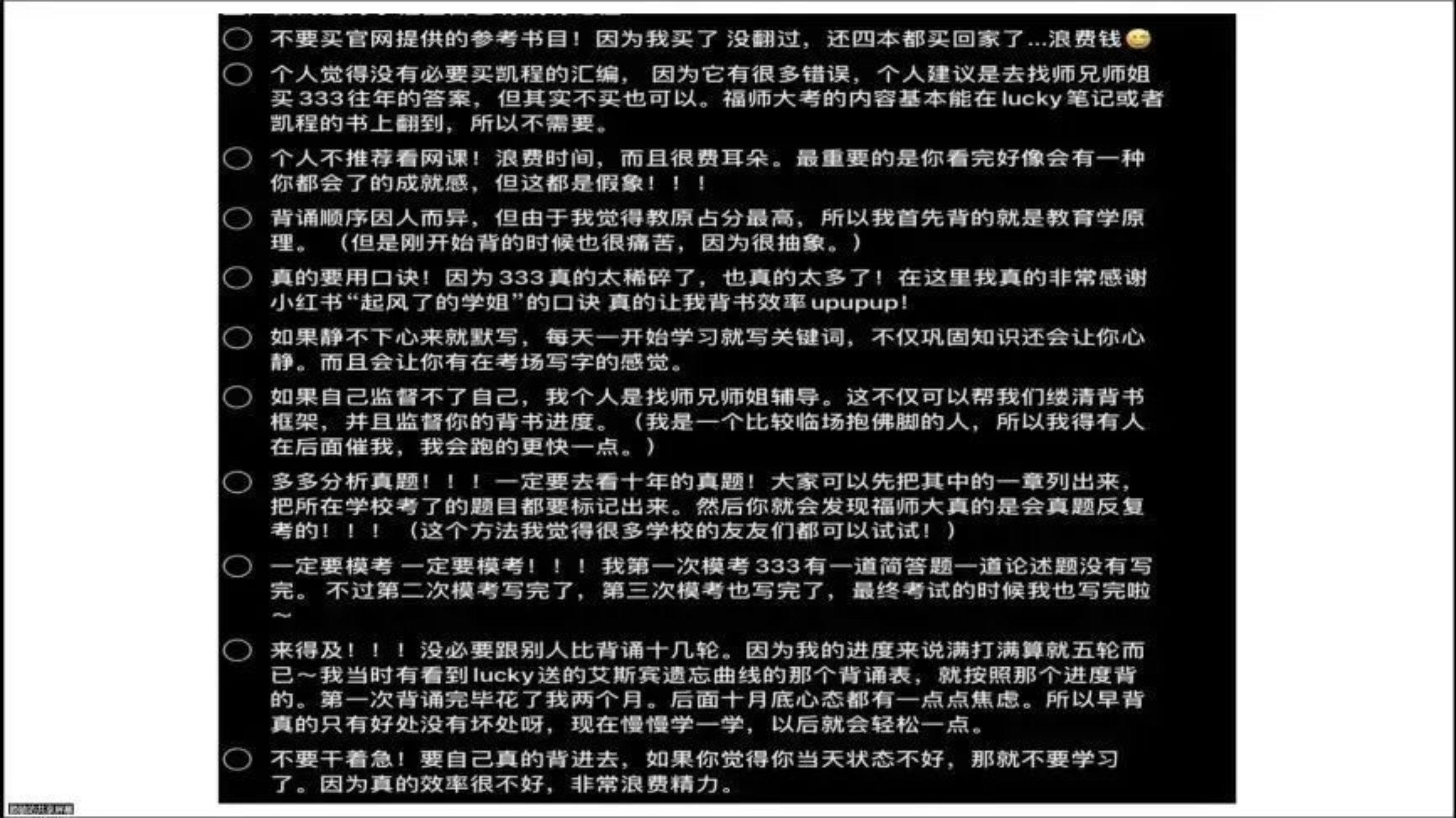 分享的结尾她列出她在考研路上自己碰到的坑点和学习经验,为我们指明了求研路上的学习方式与方法。