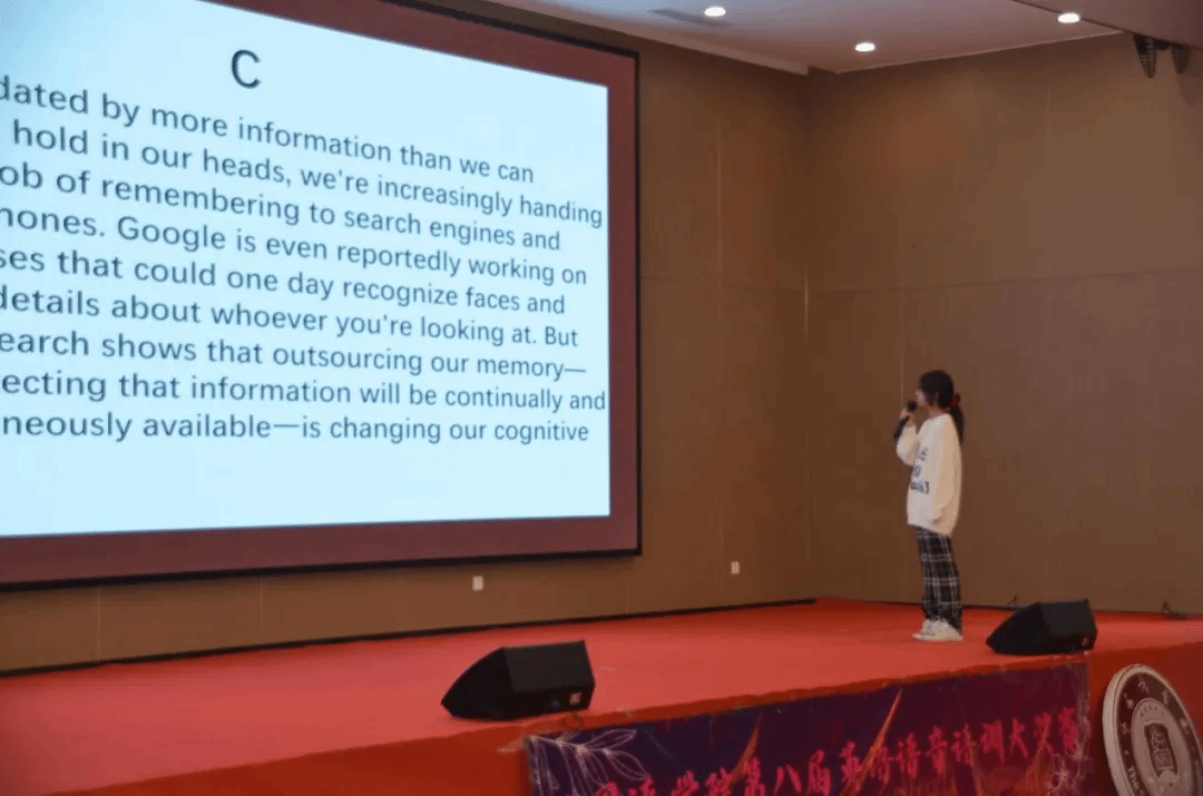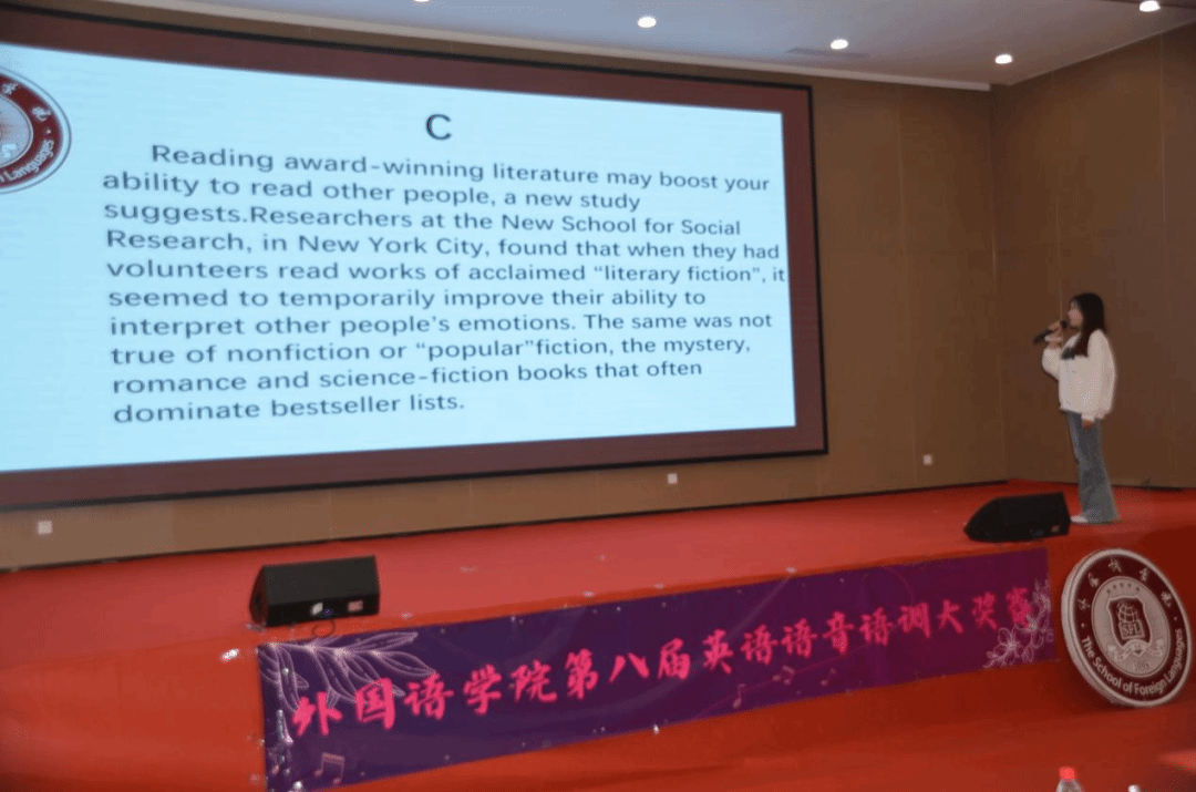 接下来是个人朗读环节,选手们随机抽取一个字母,在规定时间内朗读对应片段。这既考察了选手们的词汇量又考察了他们的朗读能力,同时也考察了选手们的临场反应。选手们从容不迫,用流利的口语展现出他们扎实的英语功底。